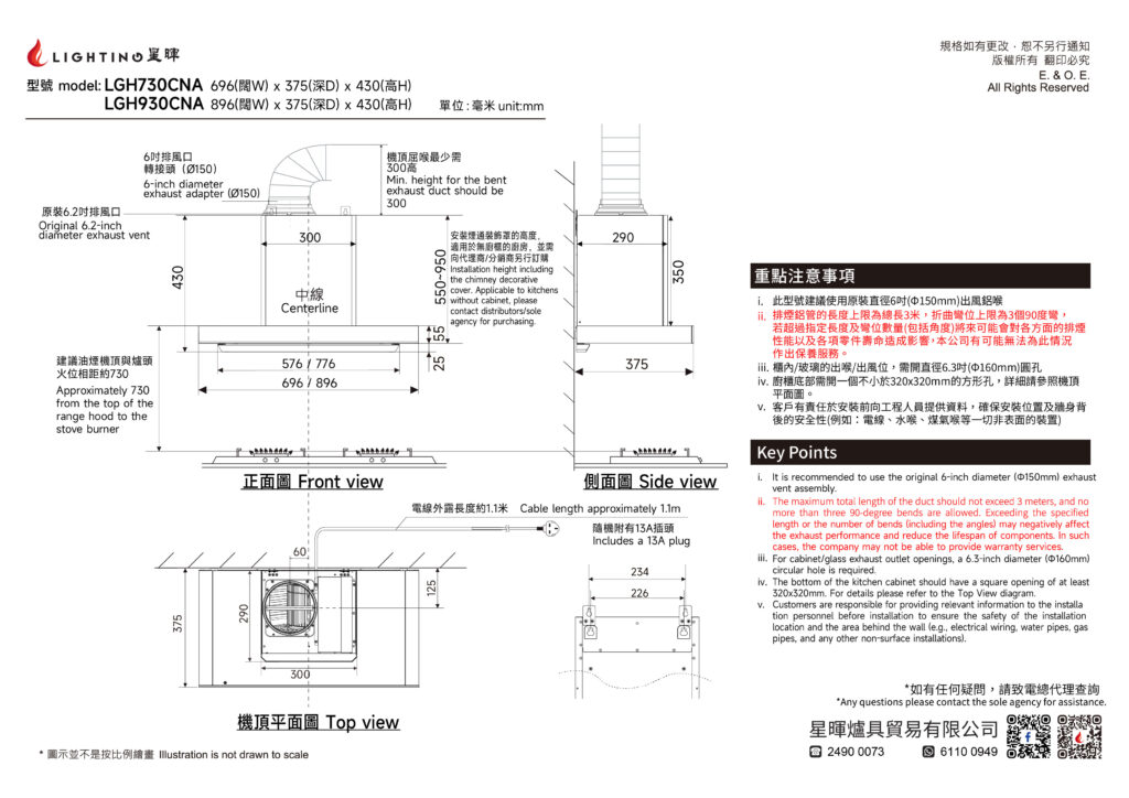產品示意圖中的排煙管伸縮裝飾罩並非標準配置,需另行付費購買,費用為HKD$300